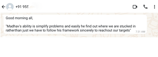Thanks to Madhav Sir, he teaches wealth means not only financial but also health, freedom, mindset, and all. I start enjoying true freedom. His practical advices and frame work support me have made a something different impact on my life.